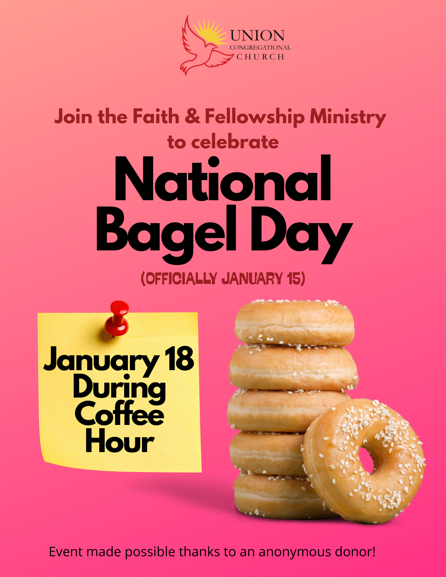 January 15 is National Bagel Day! We may not typically be together on Thursdays but that won't stop us from celebrating! So join our Faith & Fellowship Ministry during coffee hour on Sunday for some fresh bagels and cream cheese.